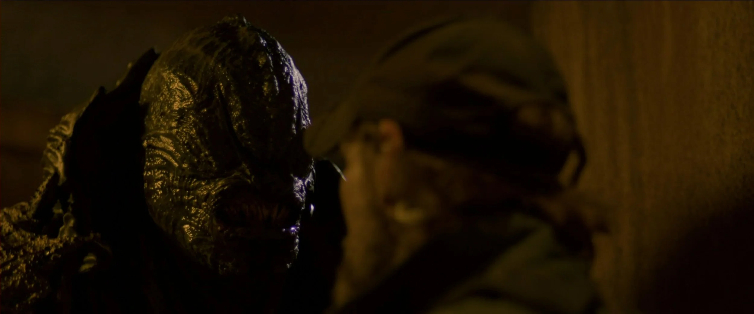 Effect wise there is a bunch as well. Besides the costumes going on, you’ve got all that gear you’d expect as well such as the guns. The alien guns look a bit prop-ish, if that makes any sense, but it looks fine regardless. The effects that go along with guns - the muzzle flashes and the impacts and the likes - are all good enough that it’s not obnoxious or too Power Rangers feeling, although that said there is plenty of sparks and some over-emphasized shoulder jerking to sell them. Violence is abound - and I wouldn’t say it’s all too often explicit in so much as just bloody. Granted, the pit might not exactly entirely sell you on it not being props, but it’s good enough to get the tone across in the scene, as is the classic skinned and headless bodies, predator style which do pop of a bit more often then the one pit scene. Maybe it’s a bit more graphic then I thought - but it still doesn’t feel as gross-out gorey as something like a zombie movie. I will point out that in the opening, when it’s still man versus man, there is an inside fight scene where things are just… weird. Like some kind of AI motion smoothing or something - I don’t know if it was just the ever possible Spectrum internet acting up while streaming, or if it’s actually the scene of the movie though.