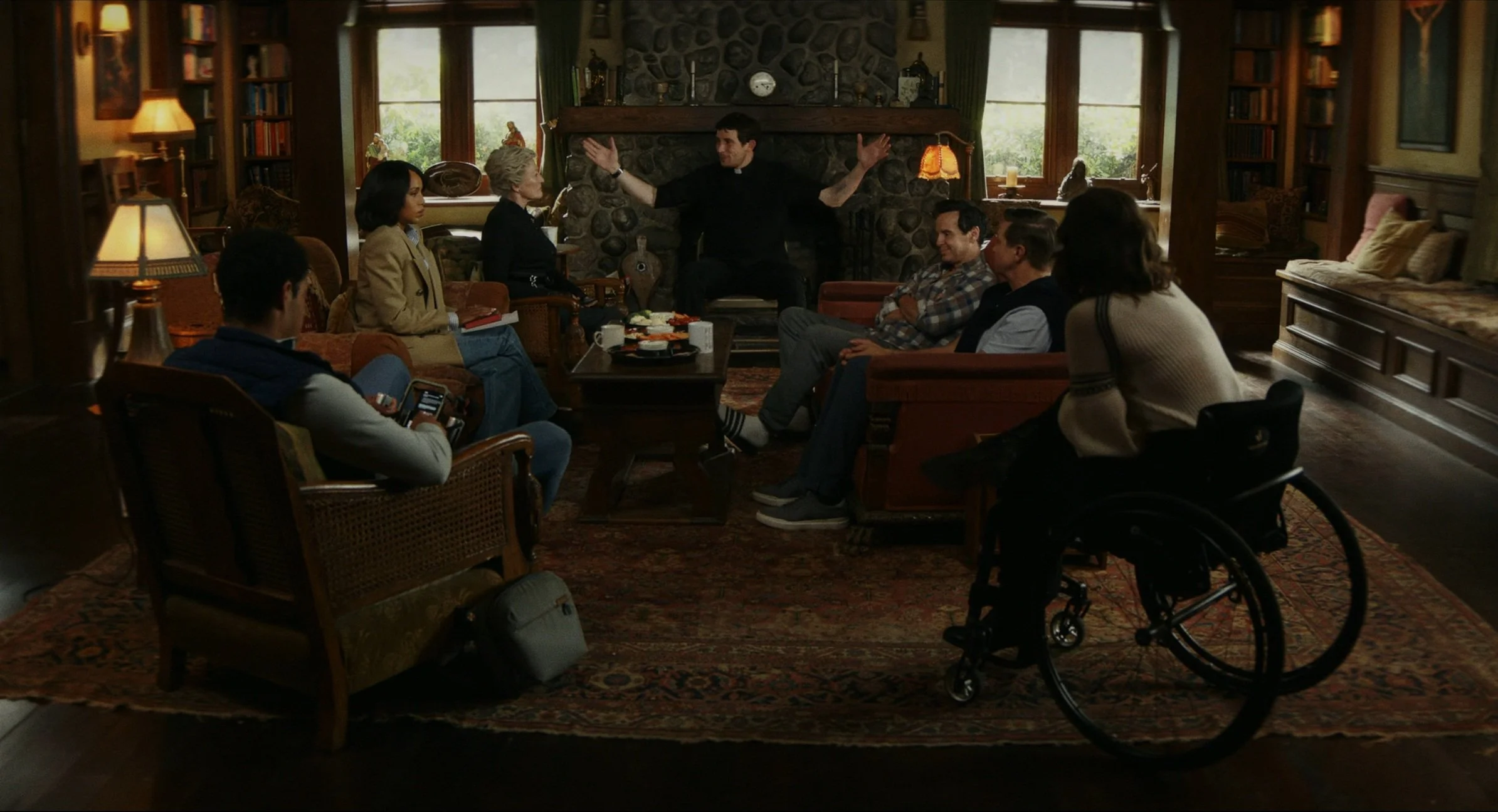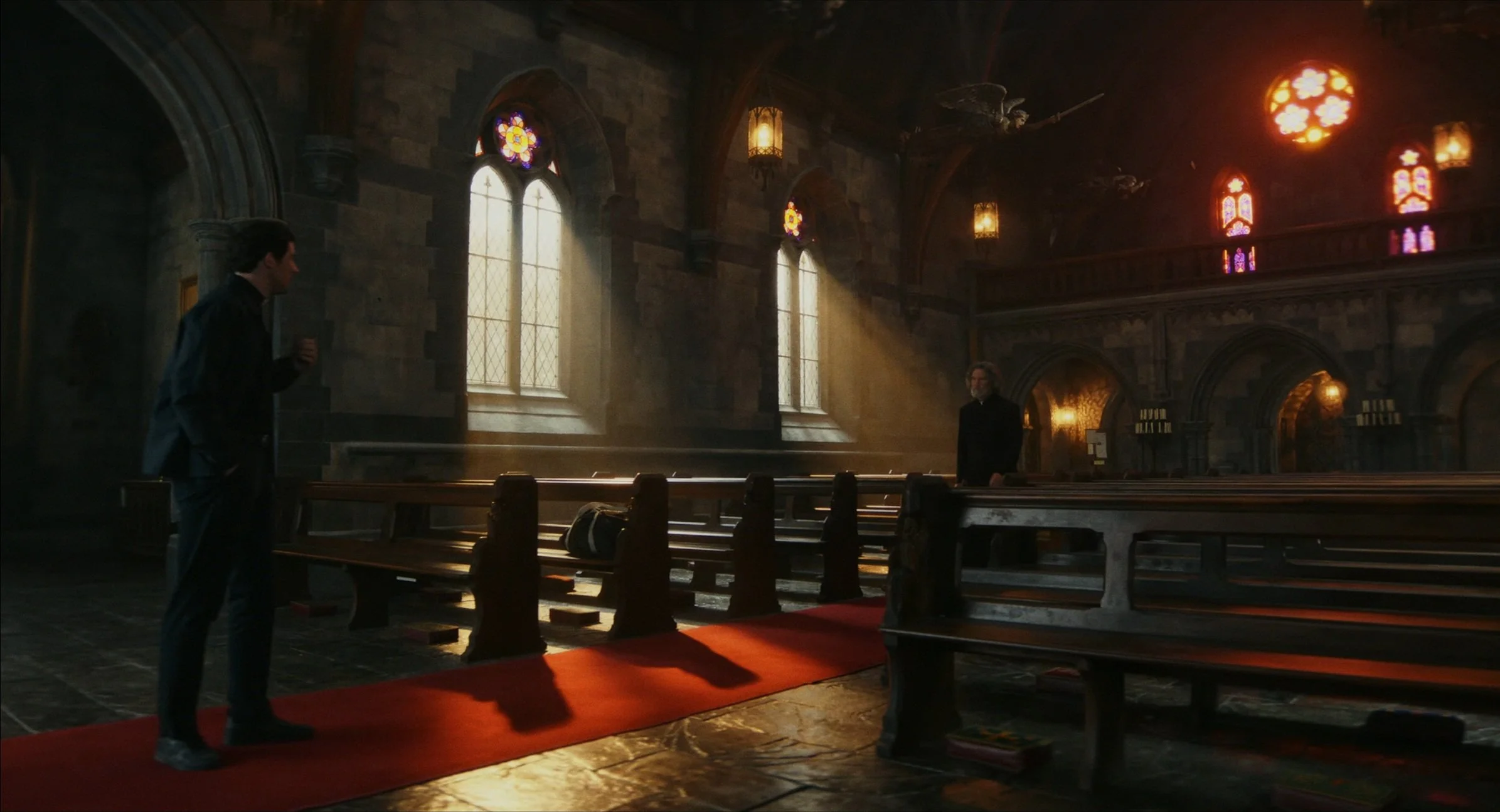 Settings are good and relatively varied all considering. We get a bunch of inside and outside shots, the insides of various buildings look distinct from one another enough you don’t get confused at all, and characters all look different enough that you won’t get them confused either. I will say, it’s a modern movie with modern attire, so despite the most elaborate thing being the fancier priest robes, it all is doing a good job of being well done costumes. Music is in a similar boat of doing what it should be doing without standing out too awful much.