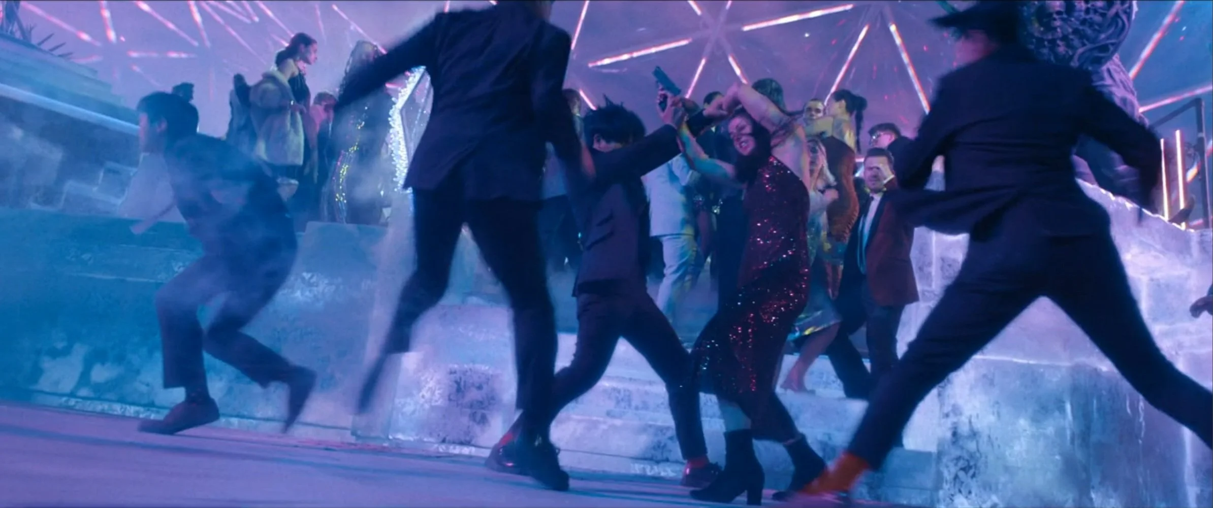 Effects are tight and flashy. Like I just mentioned, one scene is literally ninety percent weaponized explosions - to the point where trying to get a screenshot I ended up mistiming it and just getting a white screen. There is some stuff that isn’t as clean as others, as you could argue for a few moments in the other parts of the franchise as well, but most the time you don’t really notice them unless you are really looking for them so it’s never something that really takes you out of it. The settings get some of this treatment as well - a super cold club with ice everywhere, normal building interiors, all the way to our final set that takes place across an entire snowy village. I’m sure the village was at least in part to help capture some of the Wick against everyone charm of the earlier movies - and even if it might feel a bit extreme it somehow also feels fitting for the universe it takes place in and does lead to some cool stuff. I should also mention, it also does explain it in the movie, so it’s not like it’s just suddenly this entire town is an action scene just because.